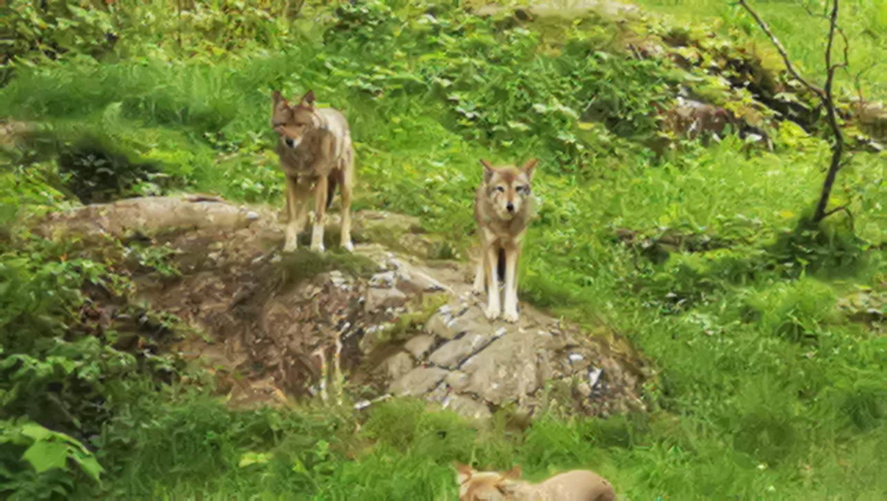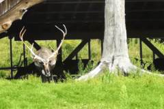 La Terre des Pionniers, plus vaste, qui offre plusieurs circuits de promenades, là les cerfs s’invitent à votre table à pique nique , et à l’observatoire des loups, on a la possibilité d’assister à leur repas à quelques mètres d’eux, derrière une vitre, ils sont magnifiques !